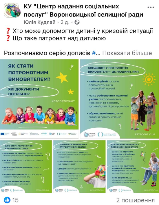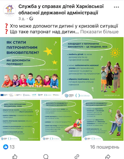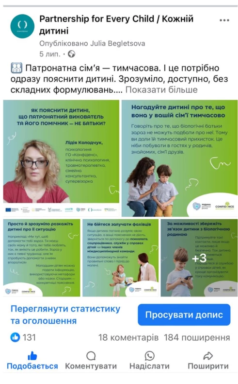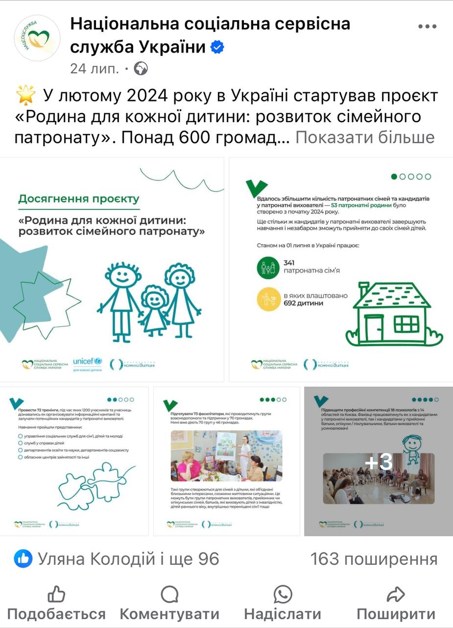 Комунікаційний супровід проєкту “Родина для кожної дитини: розвиток сімейного патронату”, що виконується спільно Дитячим фондом ООН UNICEF Ukraine, Партнерством «Кожній дитині», Міністерством соціальної політики України, Національною соціальної сервісною службою України, Координаційним центром з розвитку сімейного виховання та догляду дітей за фінансової підтримки Європейського Союзу та Австрійської Агенції Розвитку (ADA).
